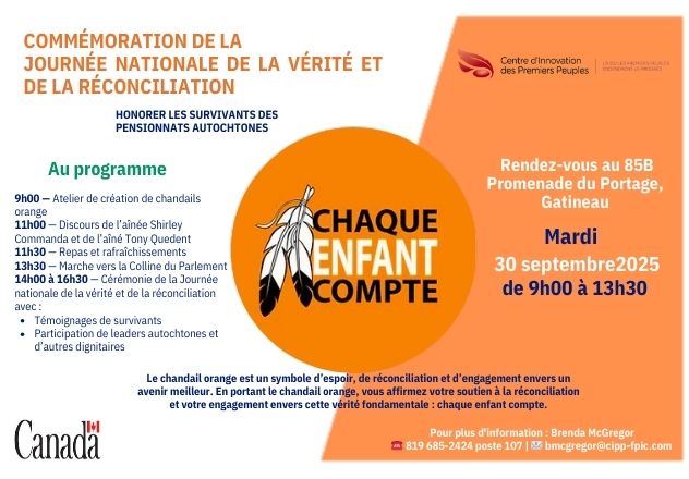 Joignez-vous à nous le 30 septembre 2025, de 9h00 à 13h30, au 85B Promenade du Portage à Gatineau, pour la Journée nationale de la vérité et de la réconciliation.