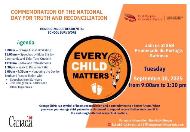 Join us on September 30, 2025, from 9:00 a.m. to 1:30 p.m., at 85B Promenade du Portage in Gatineau, for the National Day for Truth and Reconciliation.