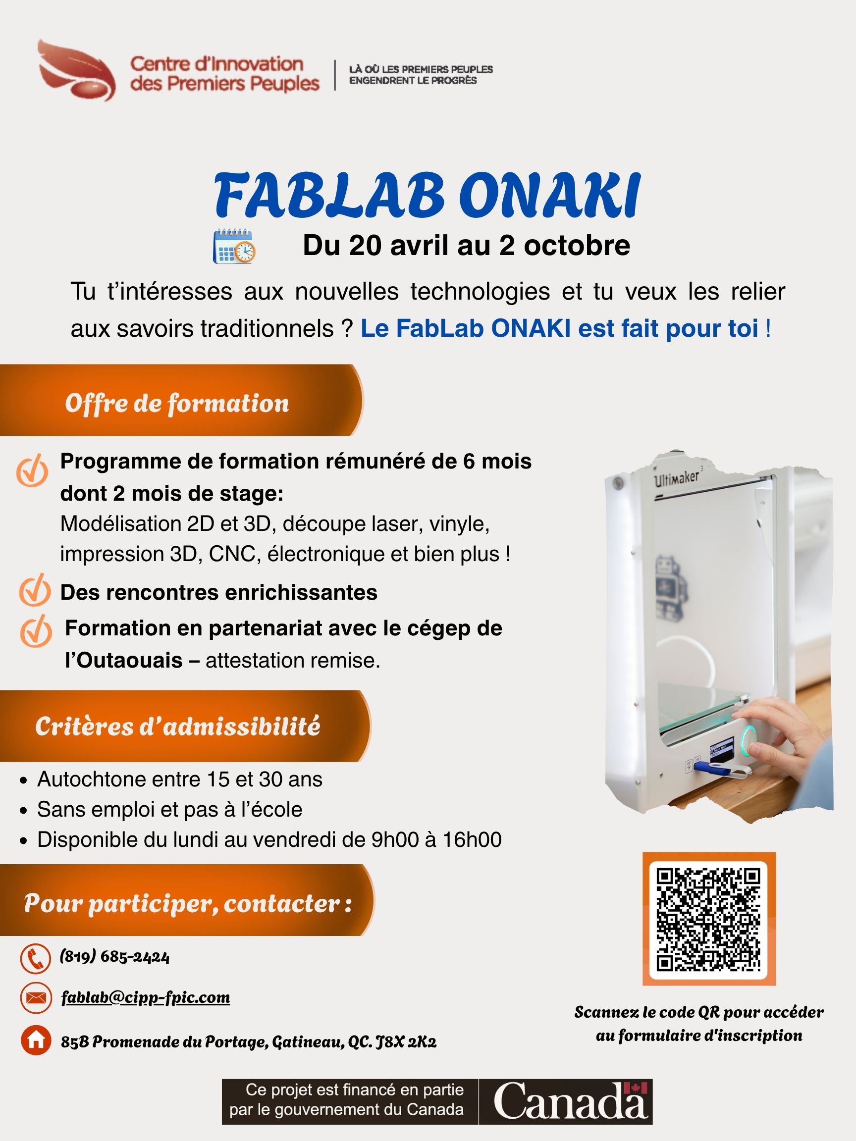 Le Centre d’Innovation des Premiers Peuples (CIPP) est fier de lancer une nouvelle cohorte du FabLab Onaki, un programme immersif qui allie technologies numériques et savoirs traditionnels.